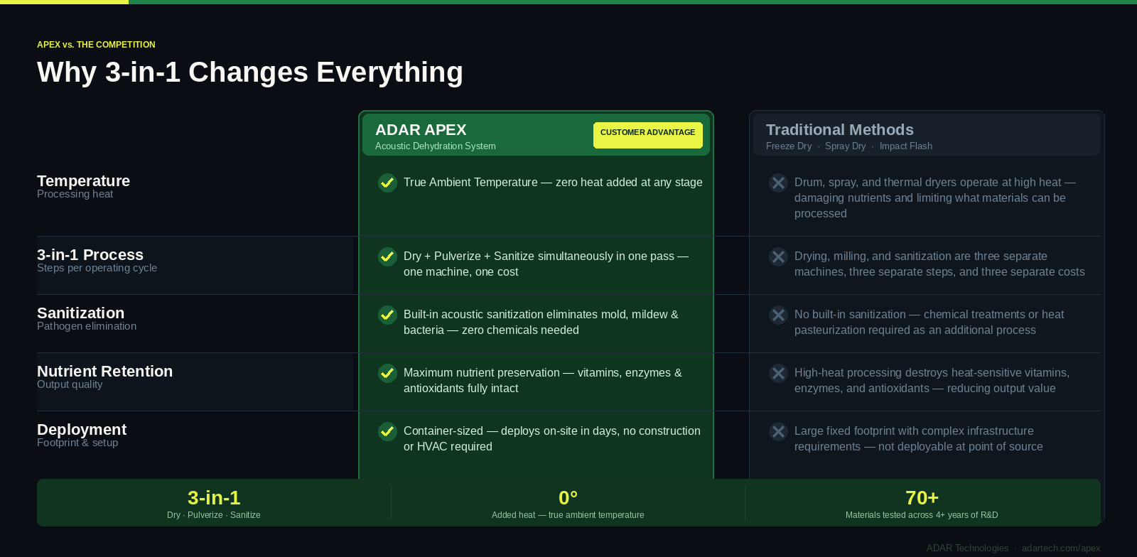 Unlike conventional dryers that rely on sustained high heat and fossil fuel inputs, APEX utilizes ADAR’s acoustic-based processing principle. This can significantly reduce energy intensity, eliminate combustion-related permitting complexity, and lower operating costs depending on the feedstock and configuration.